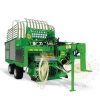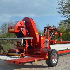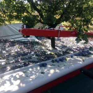 Combină de recoltat fructe MAJA 4/5/6 m pentru recoltarea prunelor, vișinelor, cireșelor. Scuturare + bandă + suflantă, colectare în containere 500 kg.
