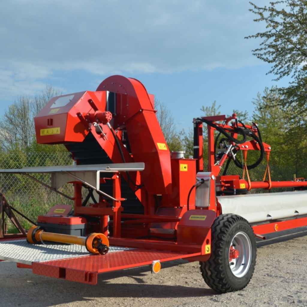 MAJA este o combină tractată pentru livezi tradiționale, care scutură fructele de pe pom și le colectează curat, datorită benzii transportoare + suflantei de separare a frunzelor/impurităților. Recoltarea se face direct în containere de până la 500 kg sau în lădițe mici.