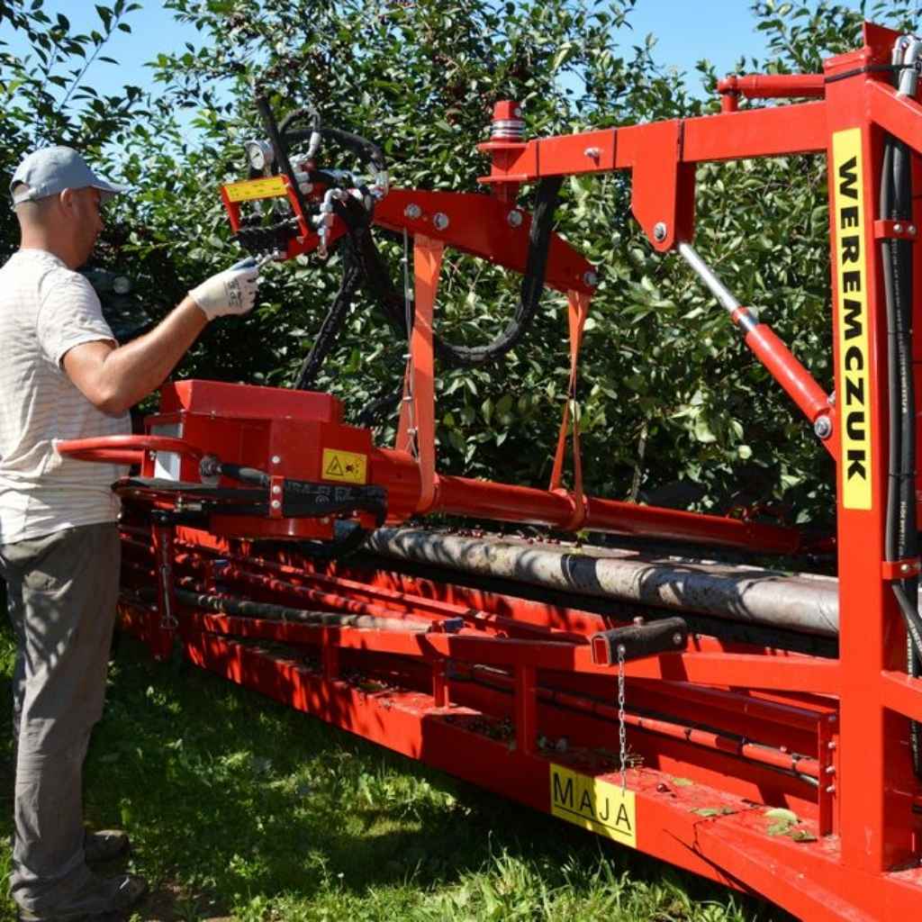 Combină de recoltat fructe MAJA (Weremczuk Agro, Polonia) este un utilaj tractat care combină scuturarea pomilor, colectarea pe ecrane, transportul pe bandă și curățirea fructelor cu suflantă într-un singur flux de lucru.